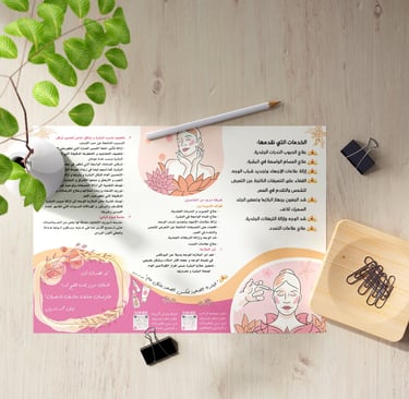 تصميم الفلاير ( Flyers ) فردية أو مطوية - تصميم بروشورات ( Brochures ) متعددة الصفحات - تصميم المنيوهات أو الرول أب أو الأعلام بجميع أنواعها - تصميم أغلفة الكتب أو الروايات أو المجلات أو ملفات الشركات ( يتم إحتسابها بالصفحة ) - تصاميم جاهزة للطباعة بدقه عالية مع مراعاة مقاسات المطابع.
