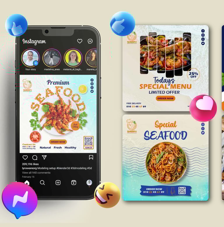 تصميم منشورات ثابتة أو متحركة ، كما نوفر تصميم القصص (Stories) و الإنفوجرافيك، و تطبيق الهوية البصرية الخاصة بعلامتك التجارية و تصاميم بجودة عالية جاهزة للنشر ، كما يتم تخصيص التصميمات بالمقاسات المناسبة لكل منصة ( فيسبوك - إنستجرام… إلخ ).